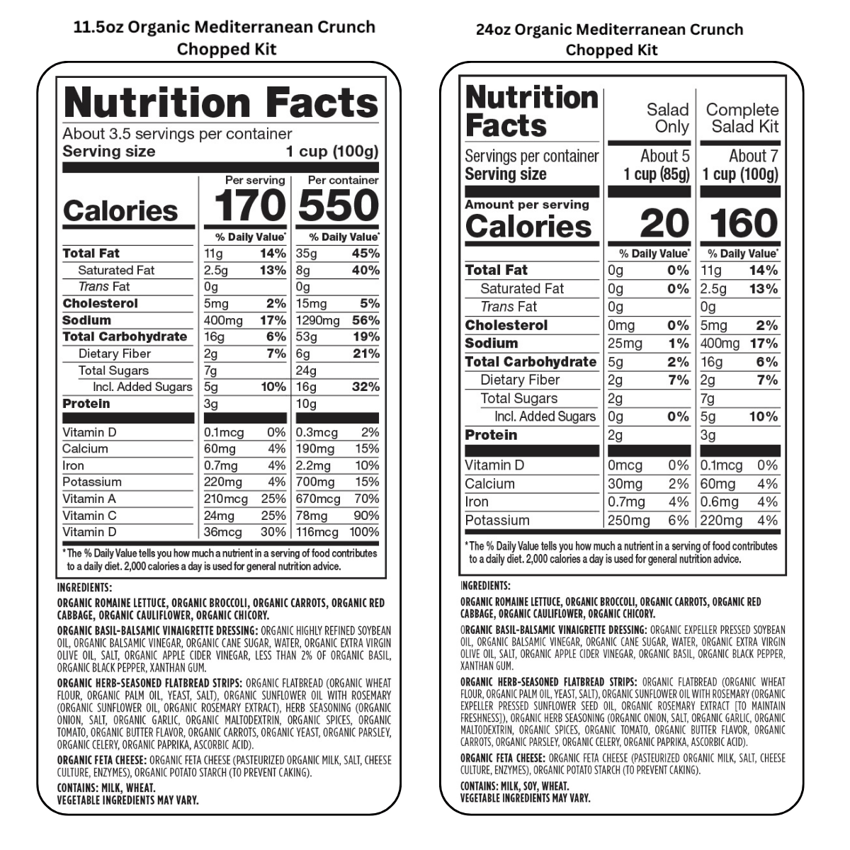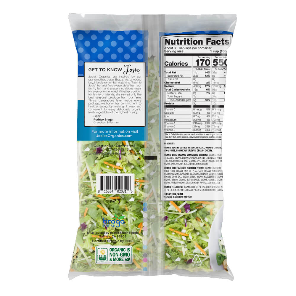 Romaine Lettuce, Broccoli, Carrots, Red Cabbage, Cauliflower, Chicory, Basil-Balsamic Vinaigrette, Herb-Seasoned Flatbread Strips, Feta Cheese